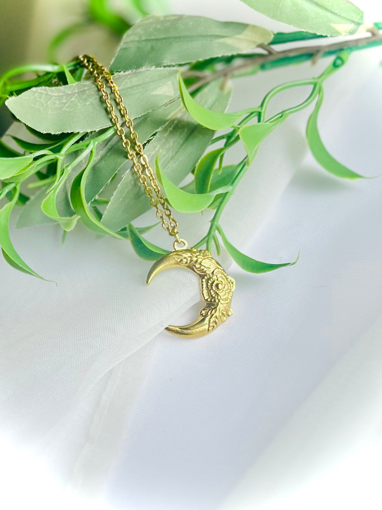 18K Gold Floral Crescent Moon Necklace on 18in gold plated chain w/ 2in extender