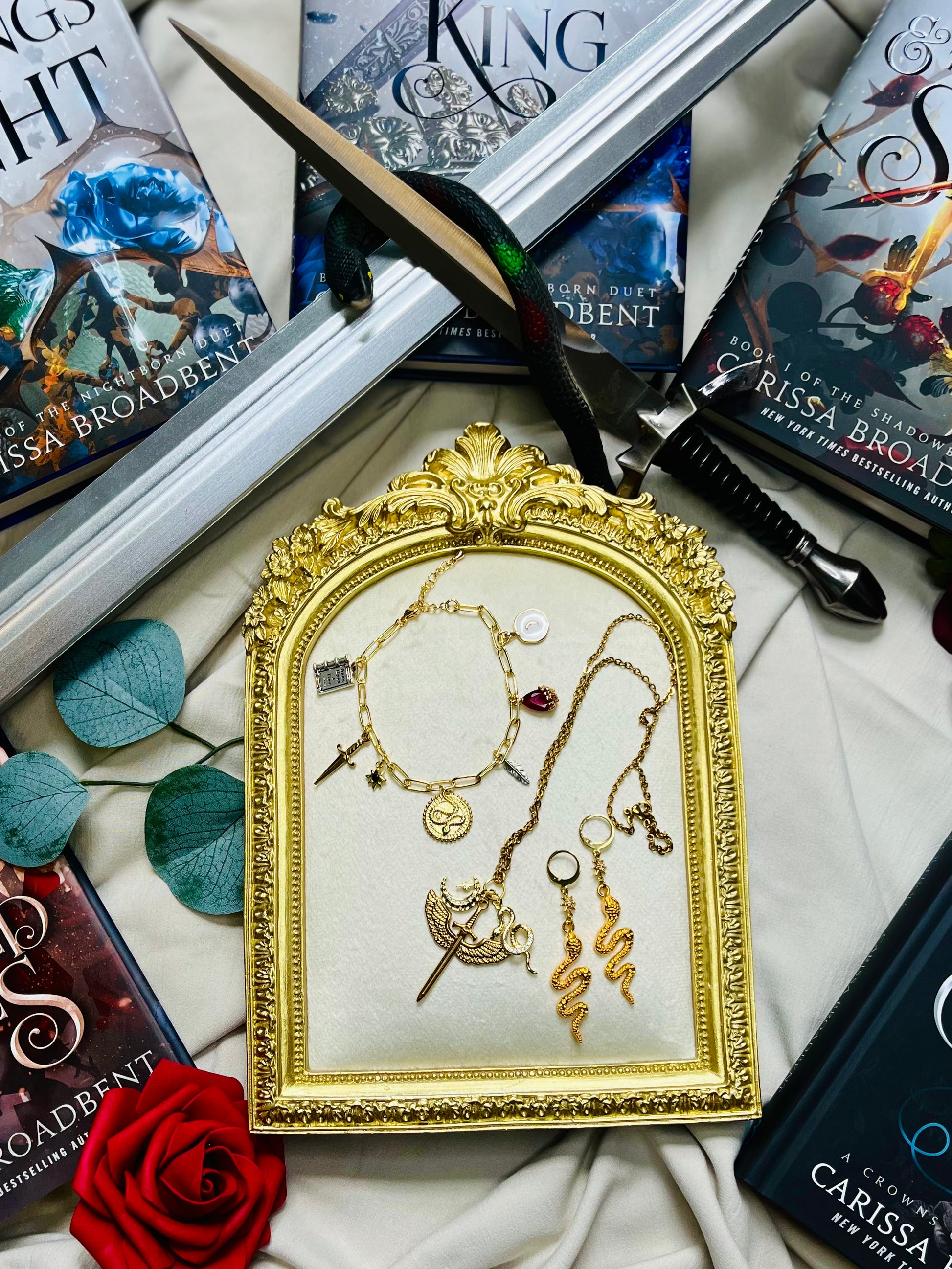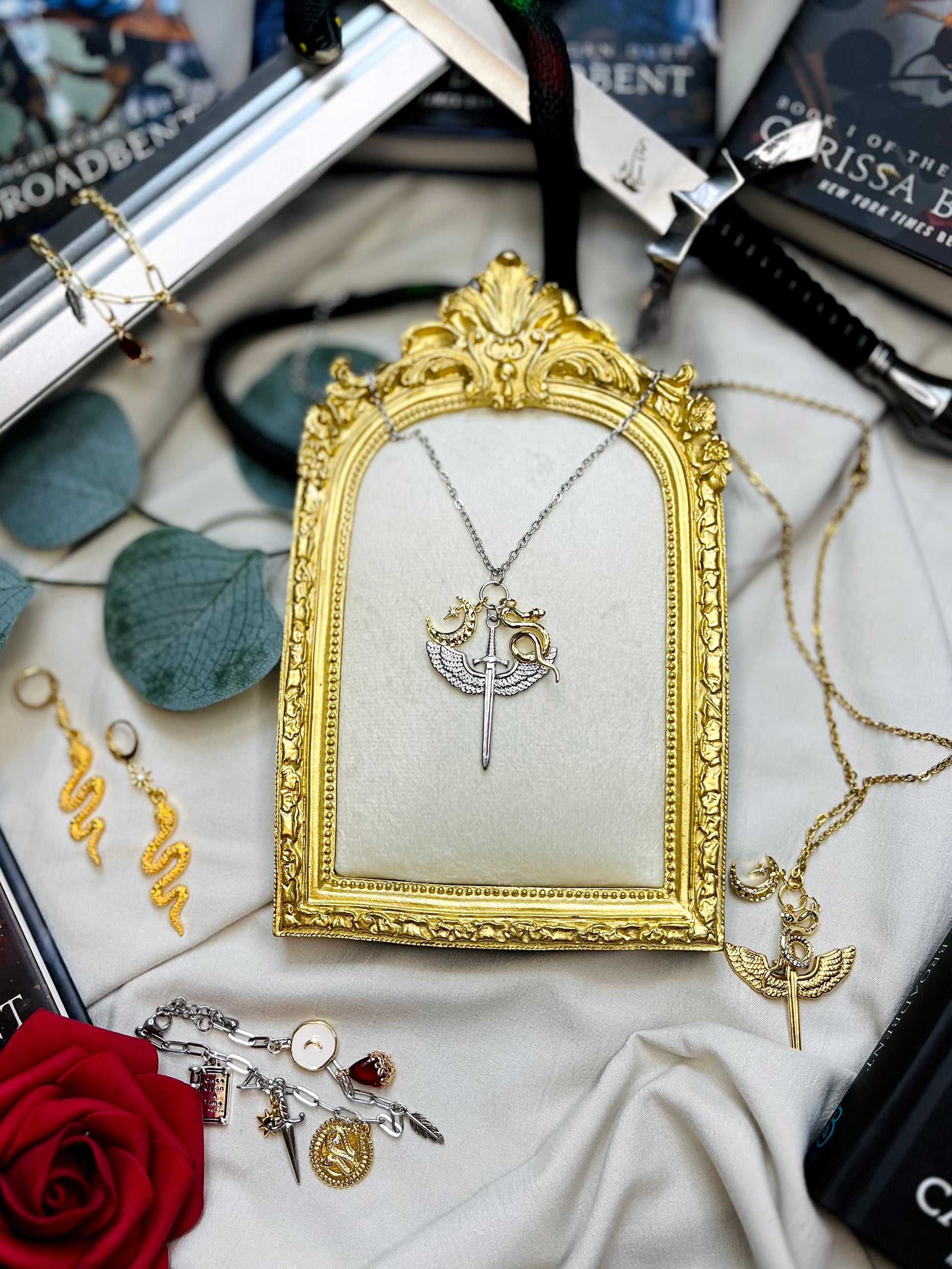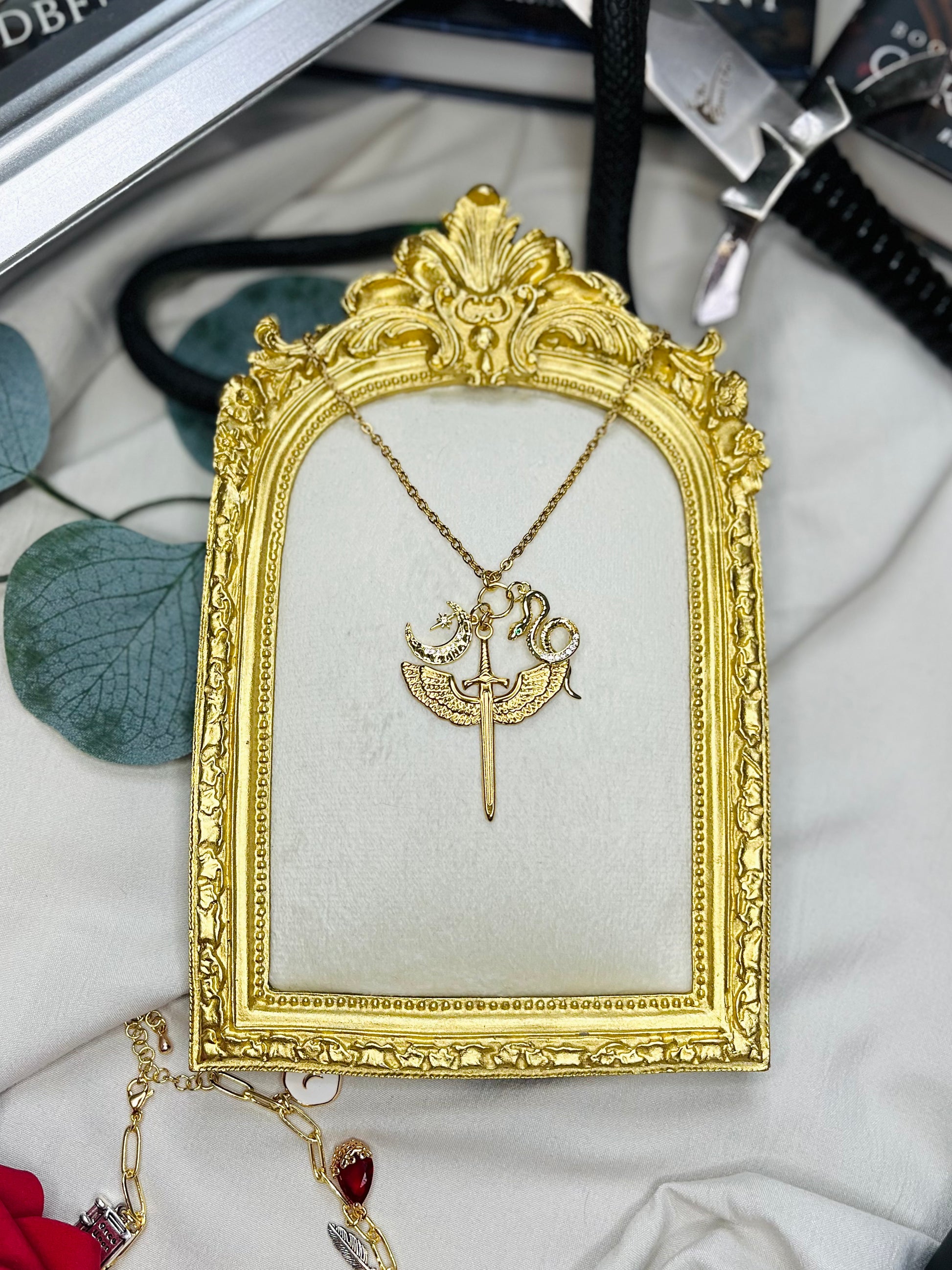 Charms Description: 18k gold plated star and moon, 18k gold plated or stainless steel sword with wings, 18k gold plated cubic zirconia snake
