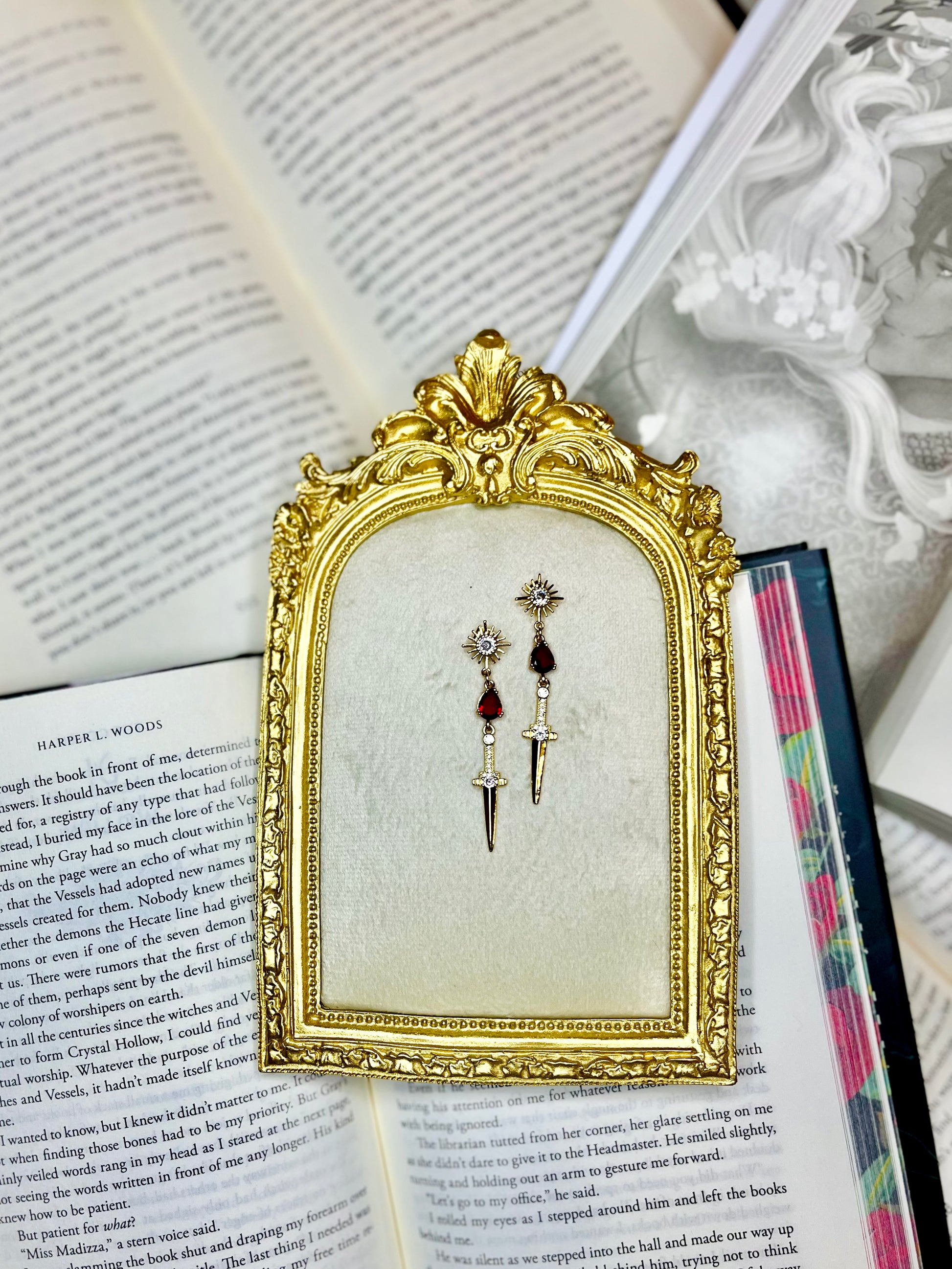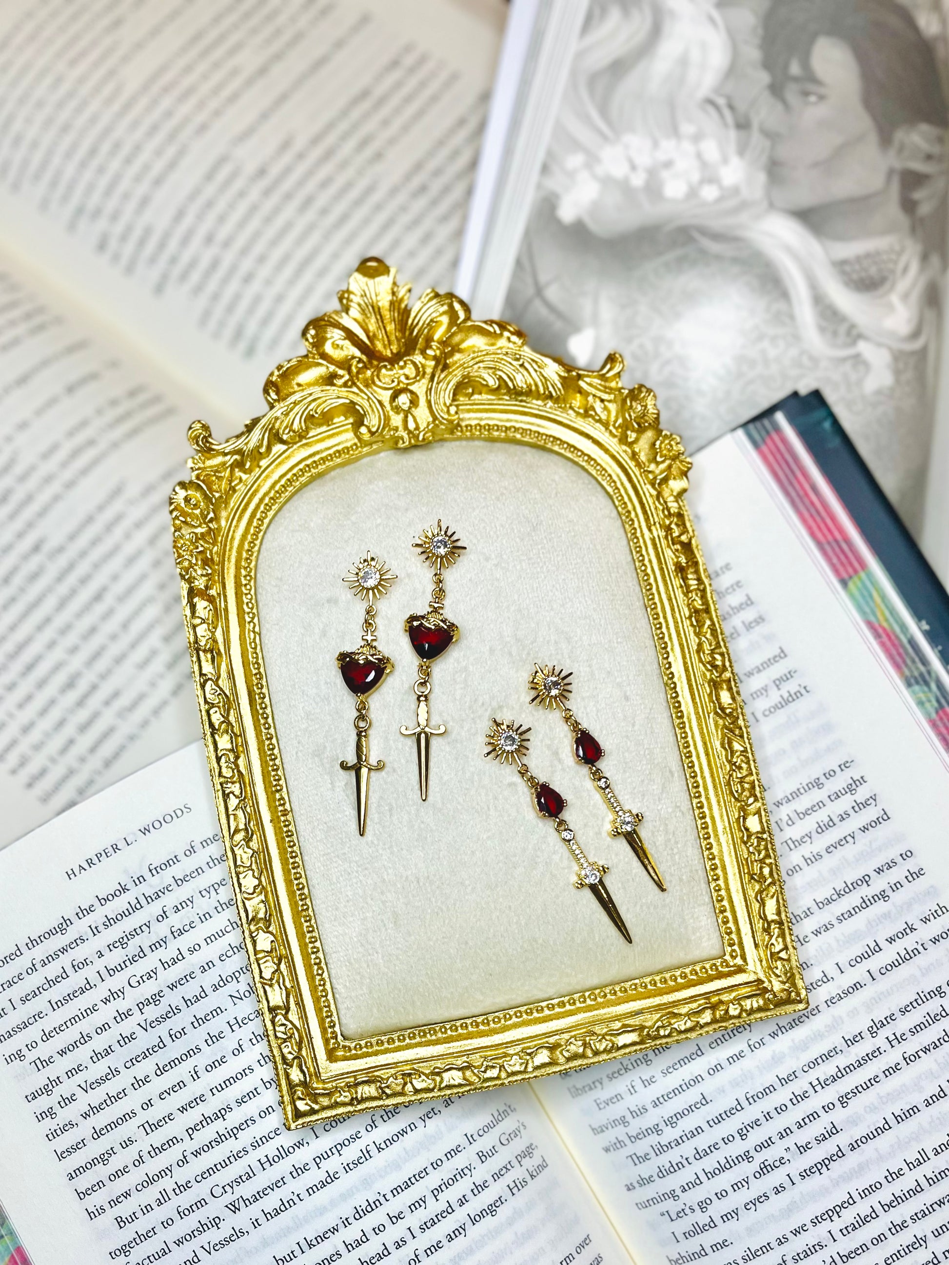Choose between two styles with crimson glass connector charms & gold plated daggers on sun burst cubic zirconia hypoallergenic gold plated studs