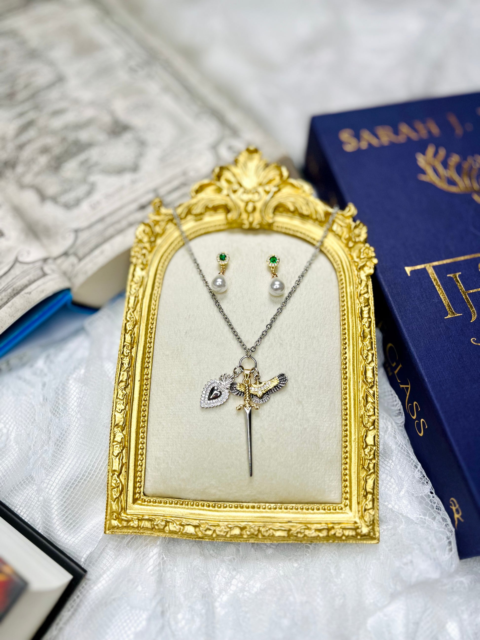 Charms description: 14k gold plated or stainless steel cubic zirconia sacred heart, 14k gold plated two toned sword, 18k gold plated two toned bird on approx. 18in gold plated chain