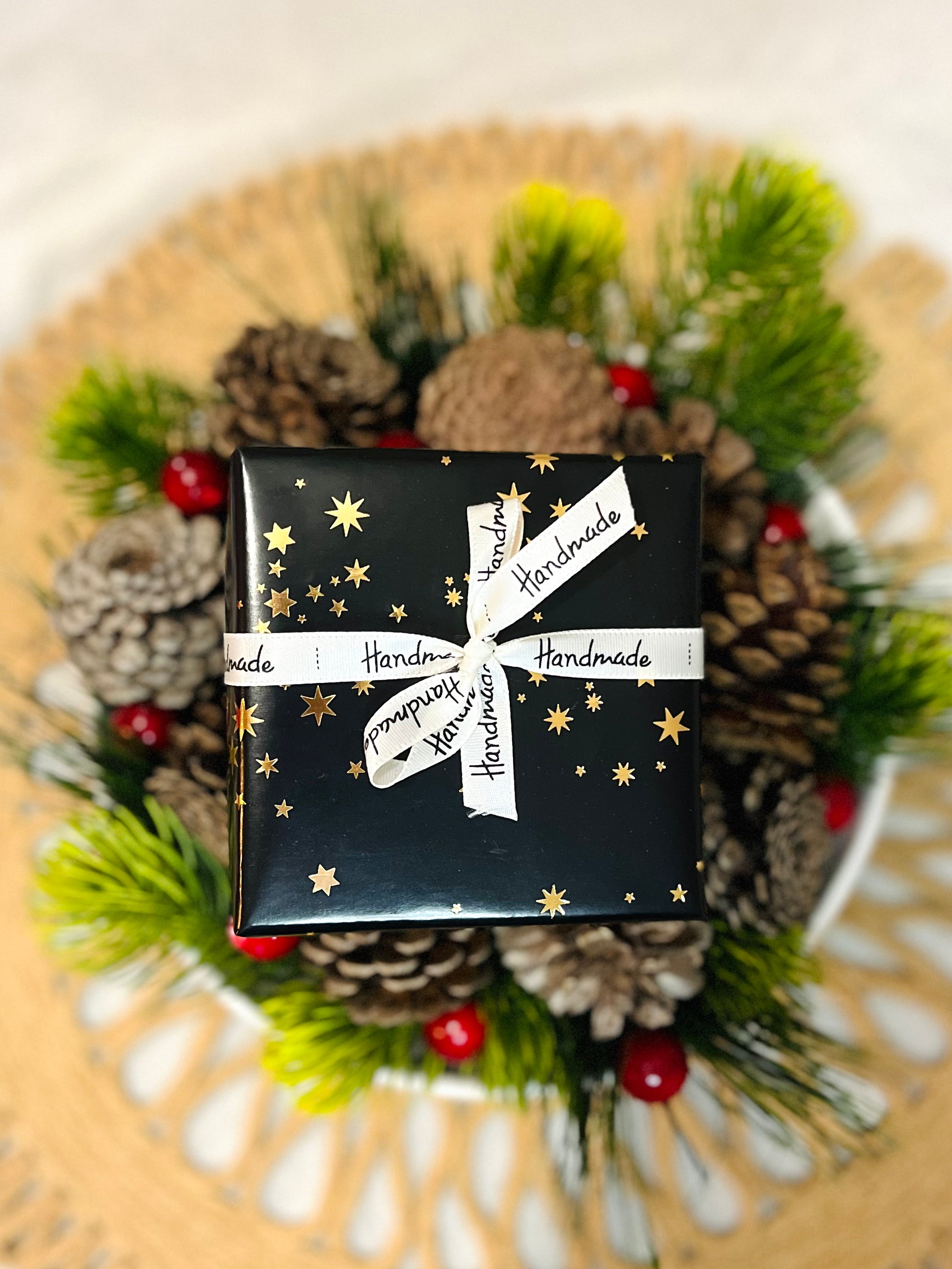 Package will include jewelry in plastic with Care Card, on padding in black box, wrapped in black w/stars wrapping paper, tied with a ribbon that says "Handmade"