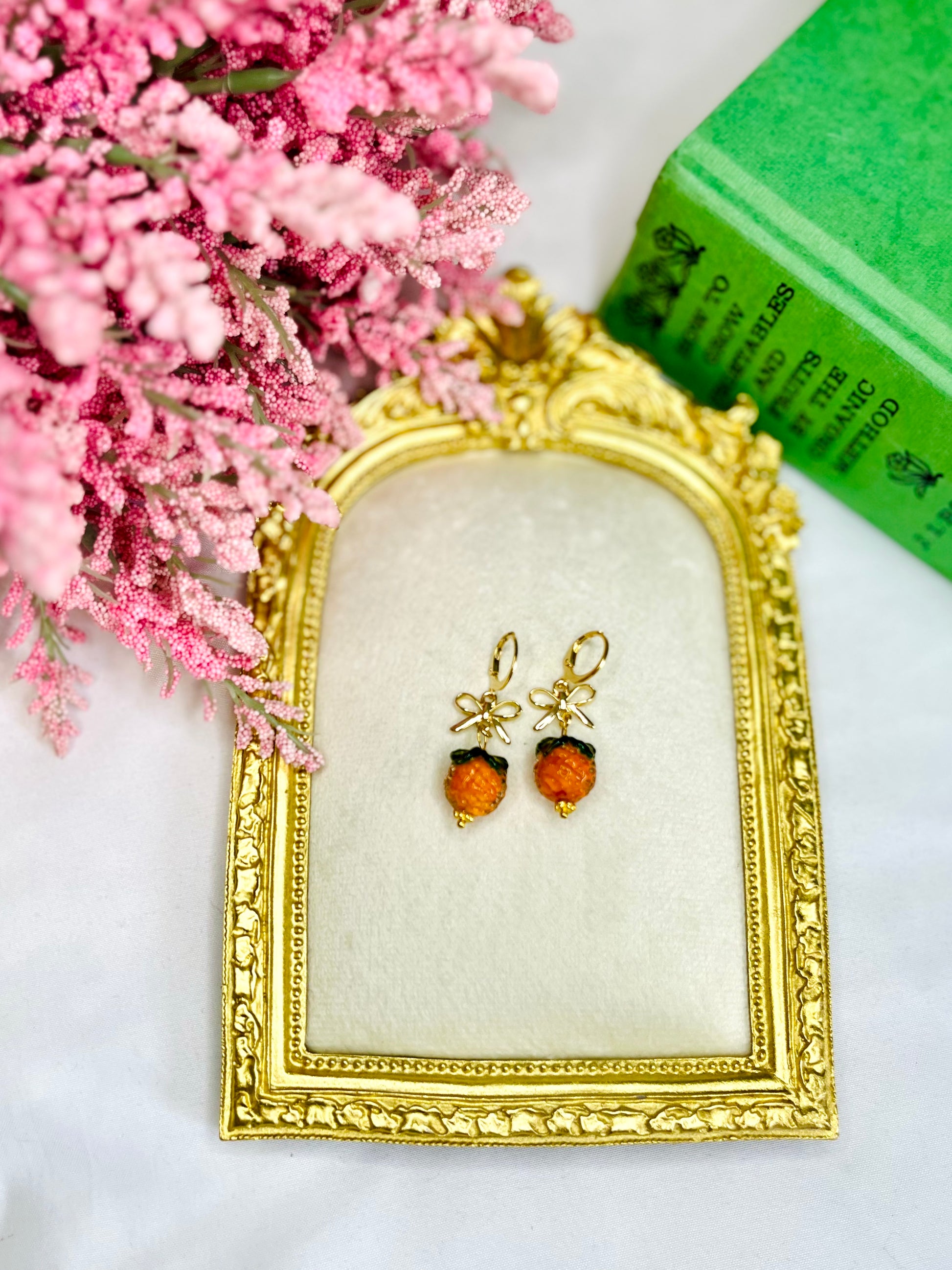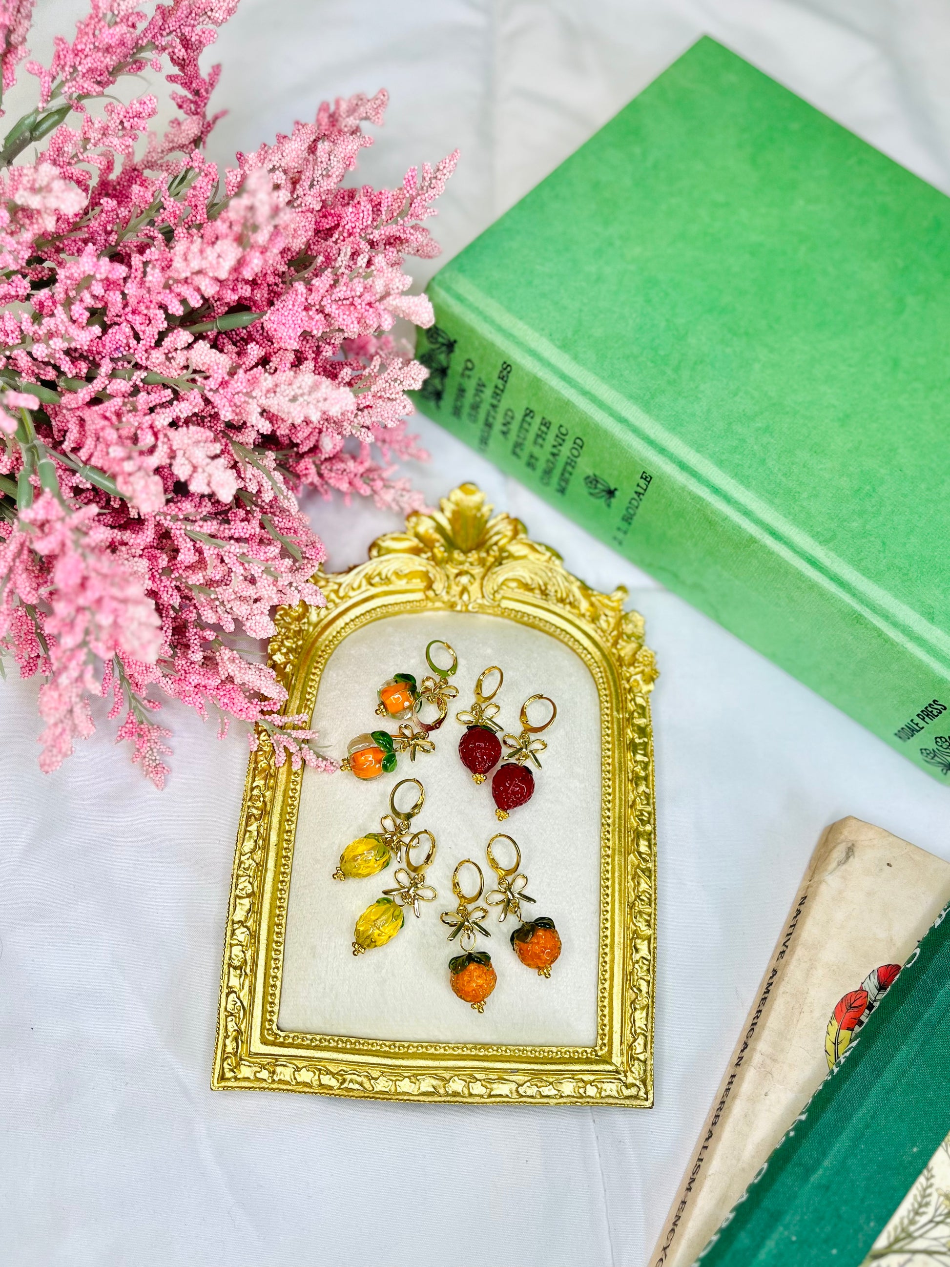 Glass Fruit Earrings w/ bow connector charms on 18K Gold Plated Hypoallergenic Huggie Hoops