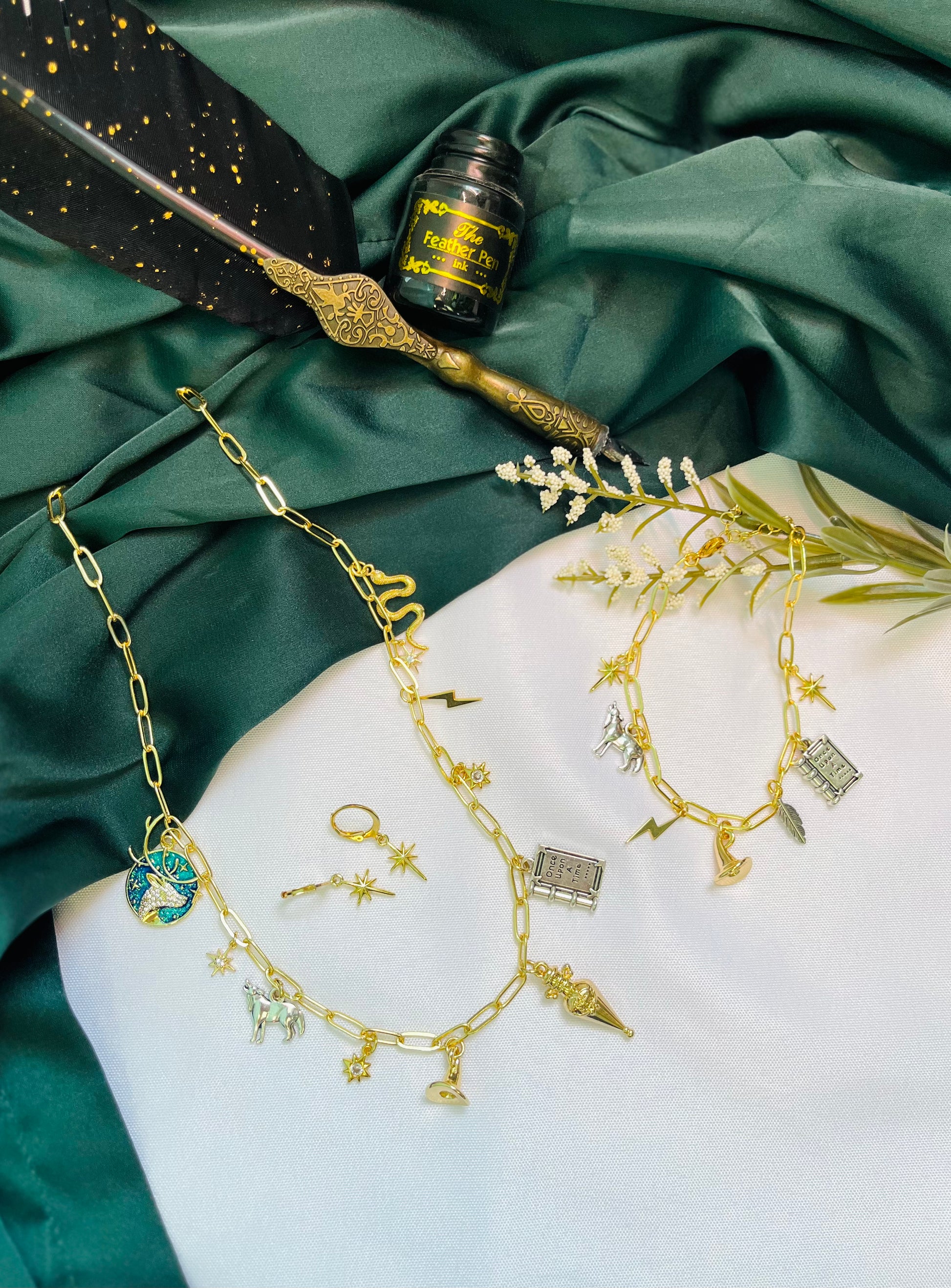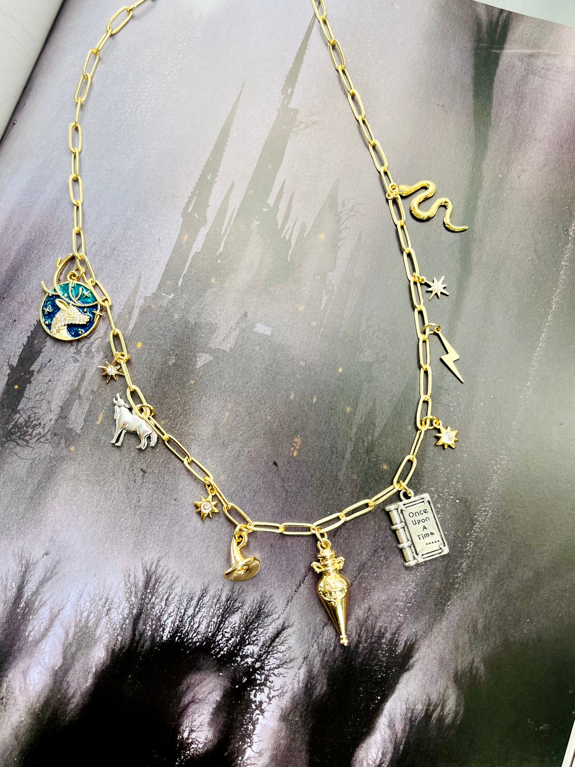 Charms Description: 14k gold plated jeweled stag, 14k gold plated star, enamel wolf, 14k gold plated star, 14k gold plated witch hat, 14k gold plated "Felix Felicis" potion bottle, enamel storybook, 14k gold plated star, 14k gold plated lightning bolt, 14k gold plated star, 14k gold snake (2 variations)