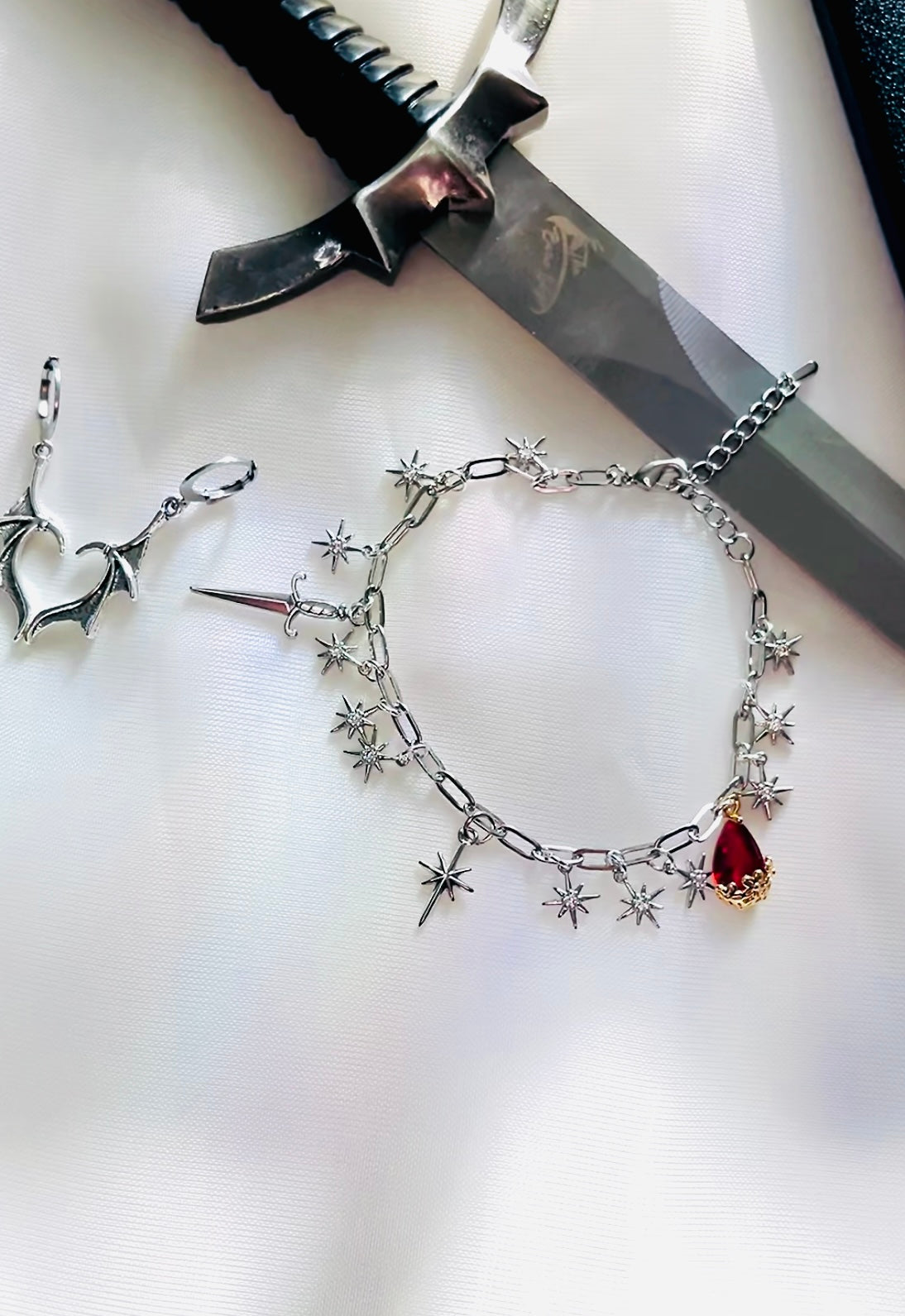Charms Description: 12 platinum plated small eight pointed stars, 14k gold plated dagger, 14k gold plated eight pointed star, 14k gold plated ruby teardrop