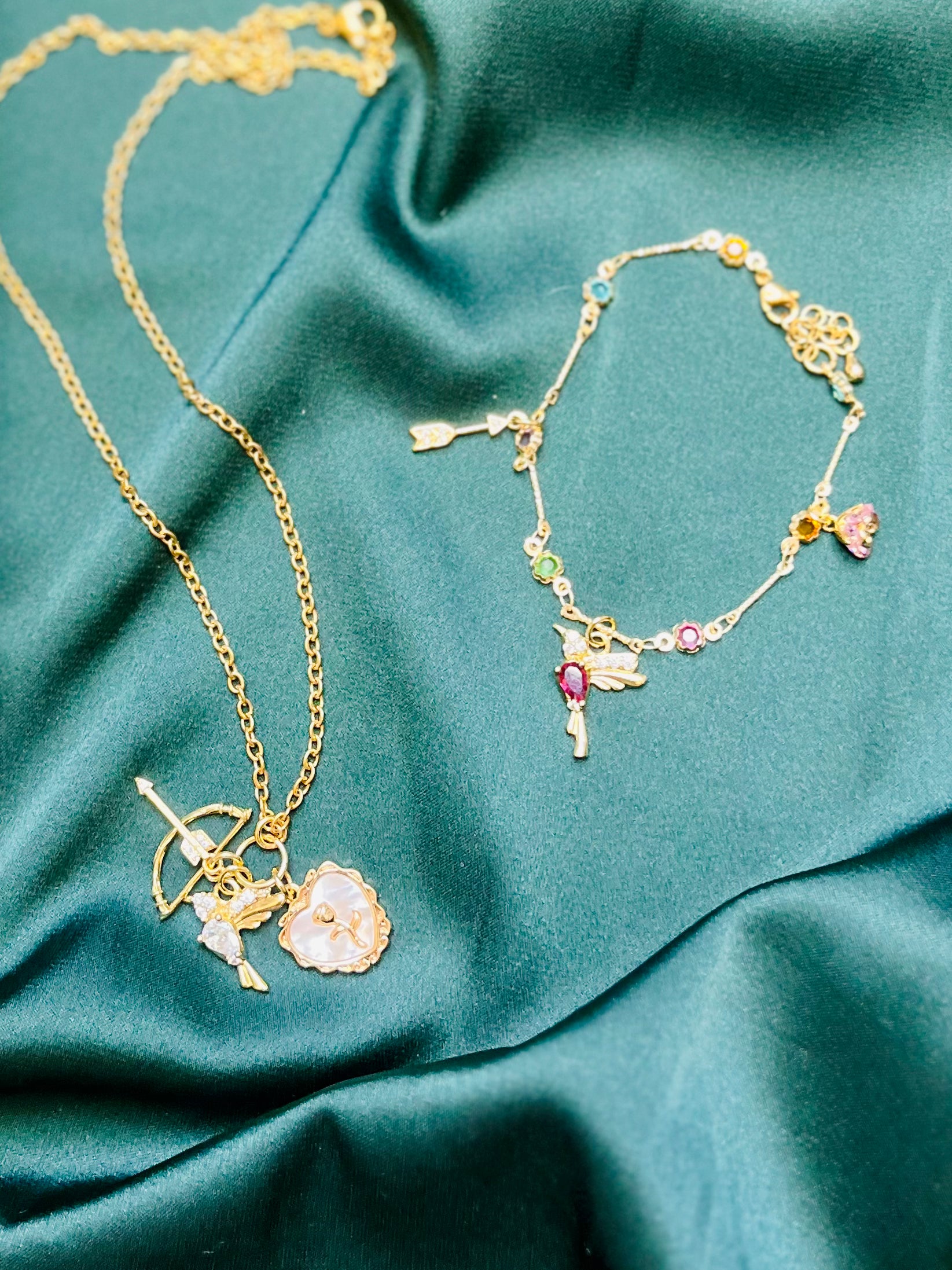 Charms Description: 18k gold plated bow and arrow, 18k gold plated cubic zirconia mockingjay (color varies: blue, pink, or clear), 14k gold plated shell rose
