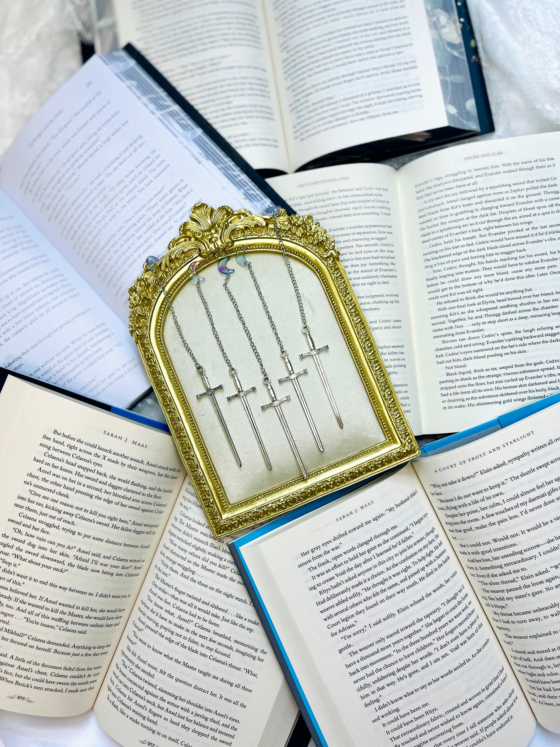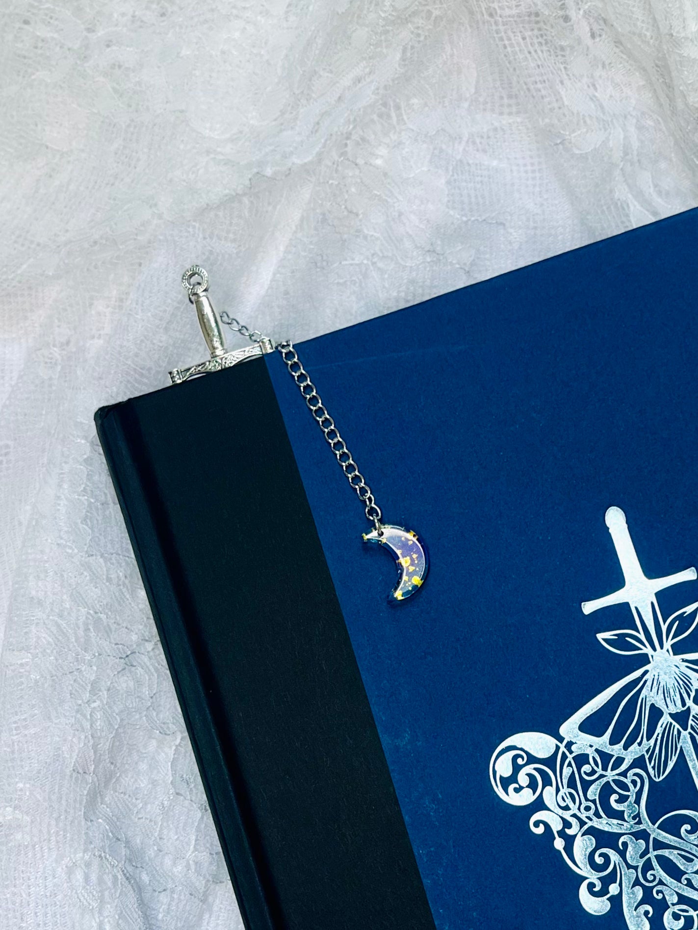Stainless steel sword bookmark w/ resin crescent moon charm (color variations may vary)