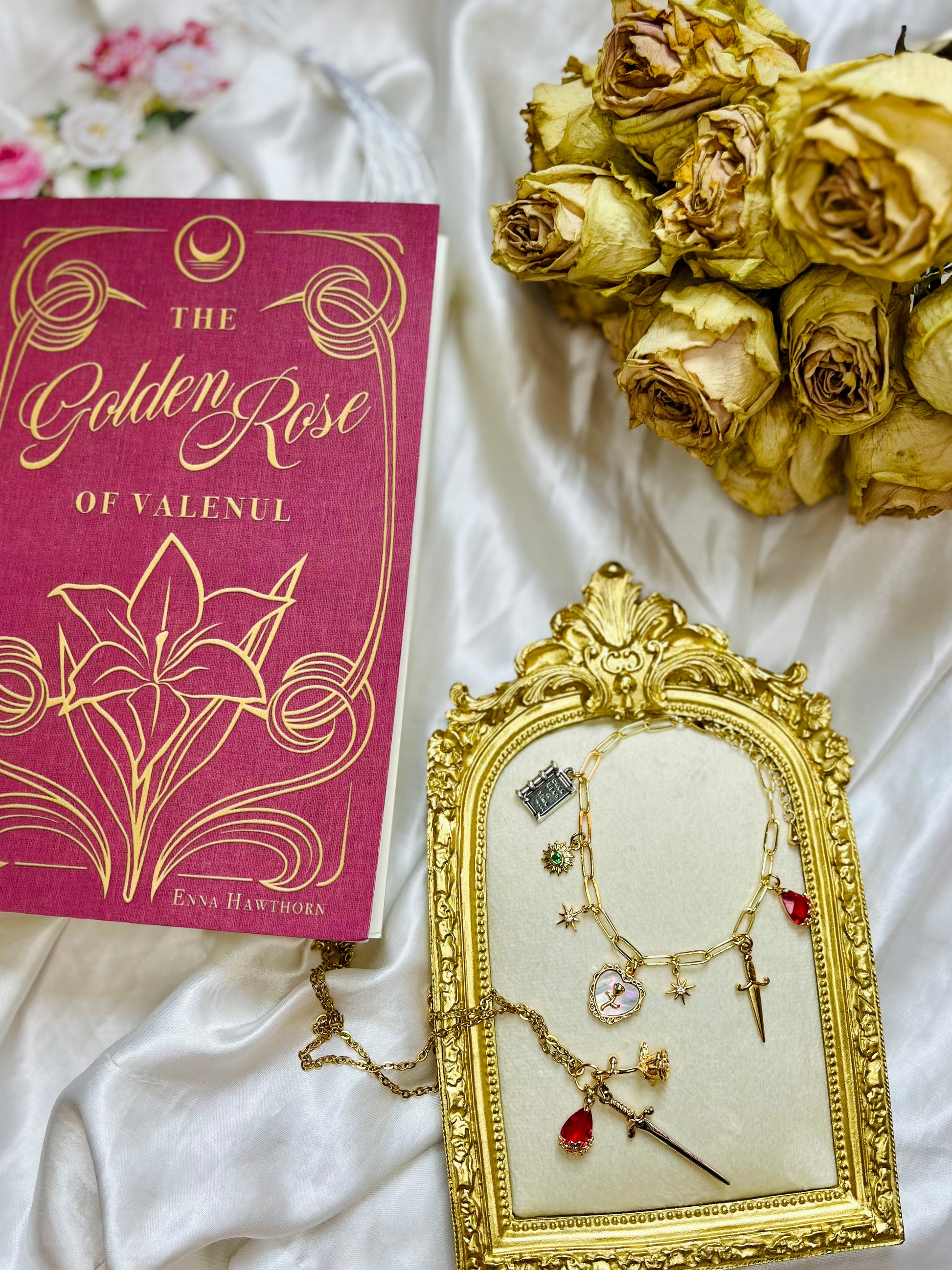 Charms Description: 14k gold plated crimson teardrop, 14k gold plated two tone sword, 14k gold plated rose