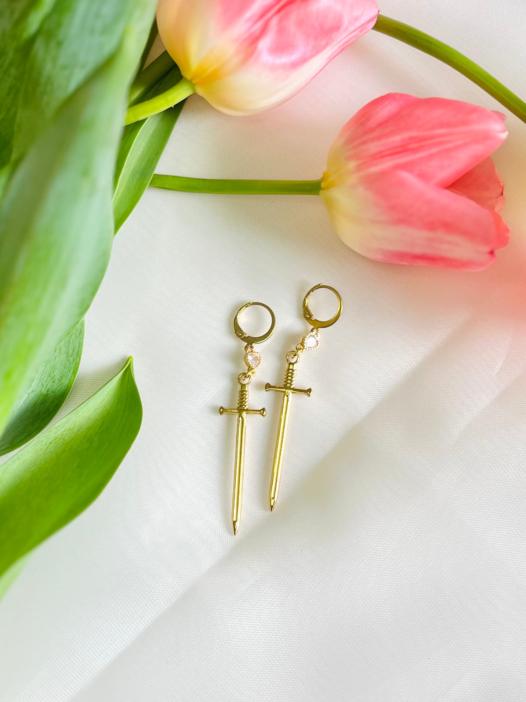 Valkyrie Sword Earrings 18K Gold Plated on cubic zirconia heart connectors